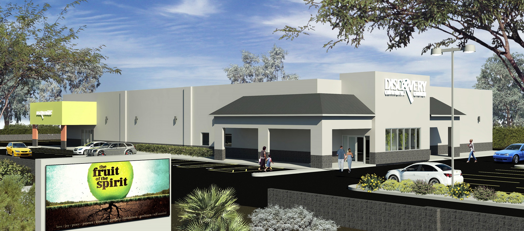 Discovery Community Church’s plans for renovation was a large scale renovation of the entire facility and included a new parking lot, lighting, exterior signage, exterior façade remodel, a new lobby design, remodeled bathrooms, sanctuary and offices.