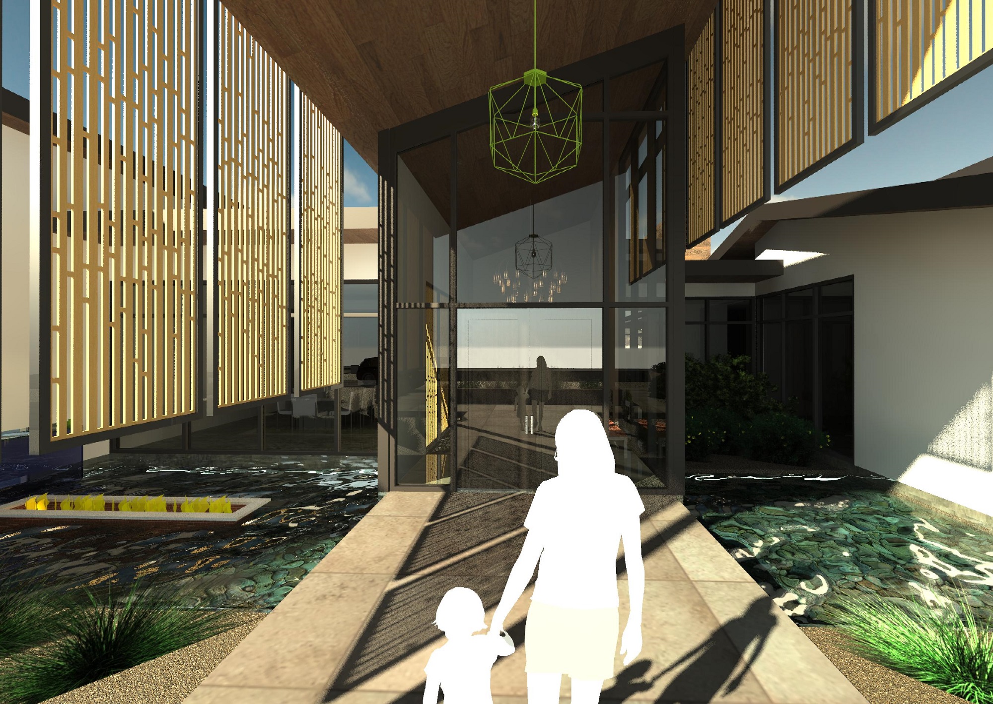 Though this project changed directions during permitting we would have loved to see this 6 bedroom, 7.5 bath with indoor basketball court and separate cabana / man cave come to fruition. As you approach the entry a water feature to the left with natural gas fire floating in the water would be seen. This was planned to be used practically as well as aesthetically. Doors from the dining room were planned to rotate in place at the water’s edge allowing for the warm air to circulate into the house on cool evening soirees. This is just one of the many amazing moments planned for this spectacular home. Call us to find out how we did motorized mechanical blinds on triangular windows!